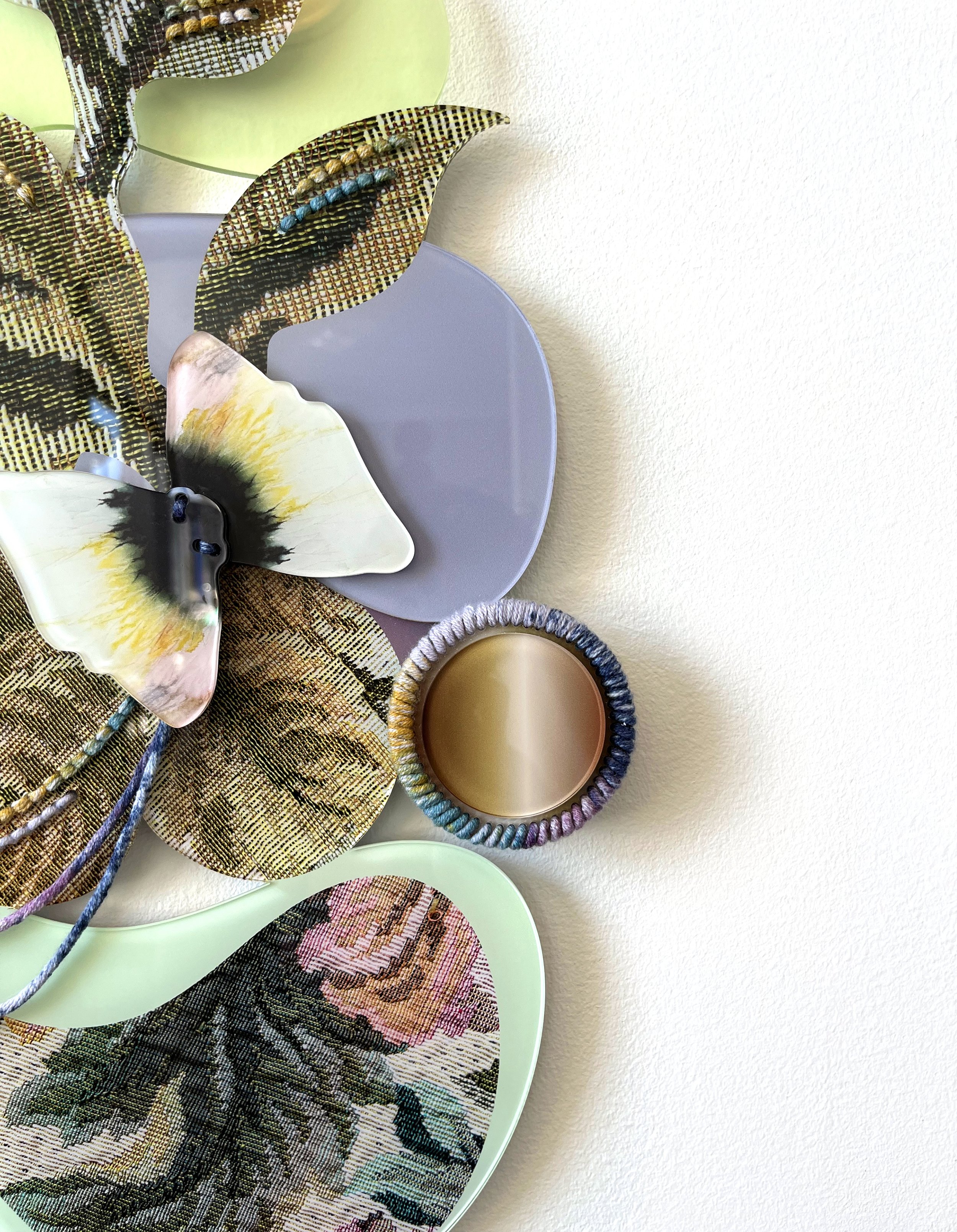 “For about fourteen years, I’ve been translating my illustrations, collages, and paintings into my rug designs that are hand-knotted in Nepal. In my latest series ‘Where Wings Tangle’ I bring the process full circle - incorporating the same yarns used in my rugs, back into my artwork as embroidered elements. My rugs inspire my art, and then my art inspires my rugs. I find my practice helps me stay grounded in a craft that has shaped my livelihood, while paying tribute to the weavers I’ve been collaborating with for over a decade.”
