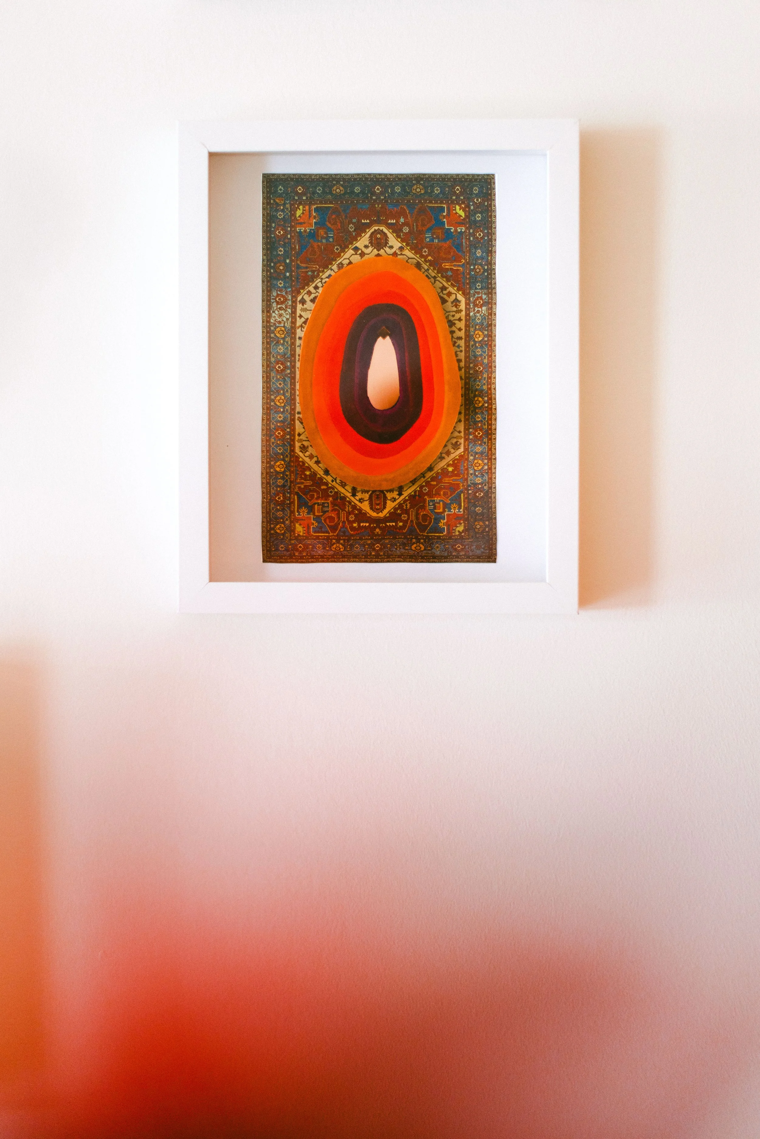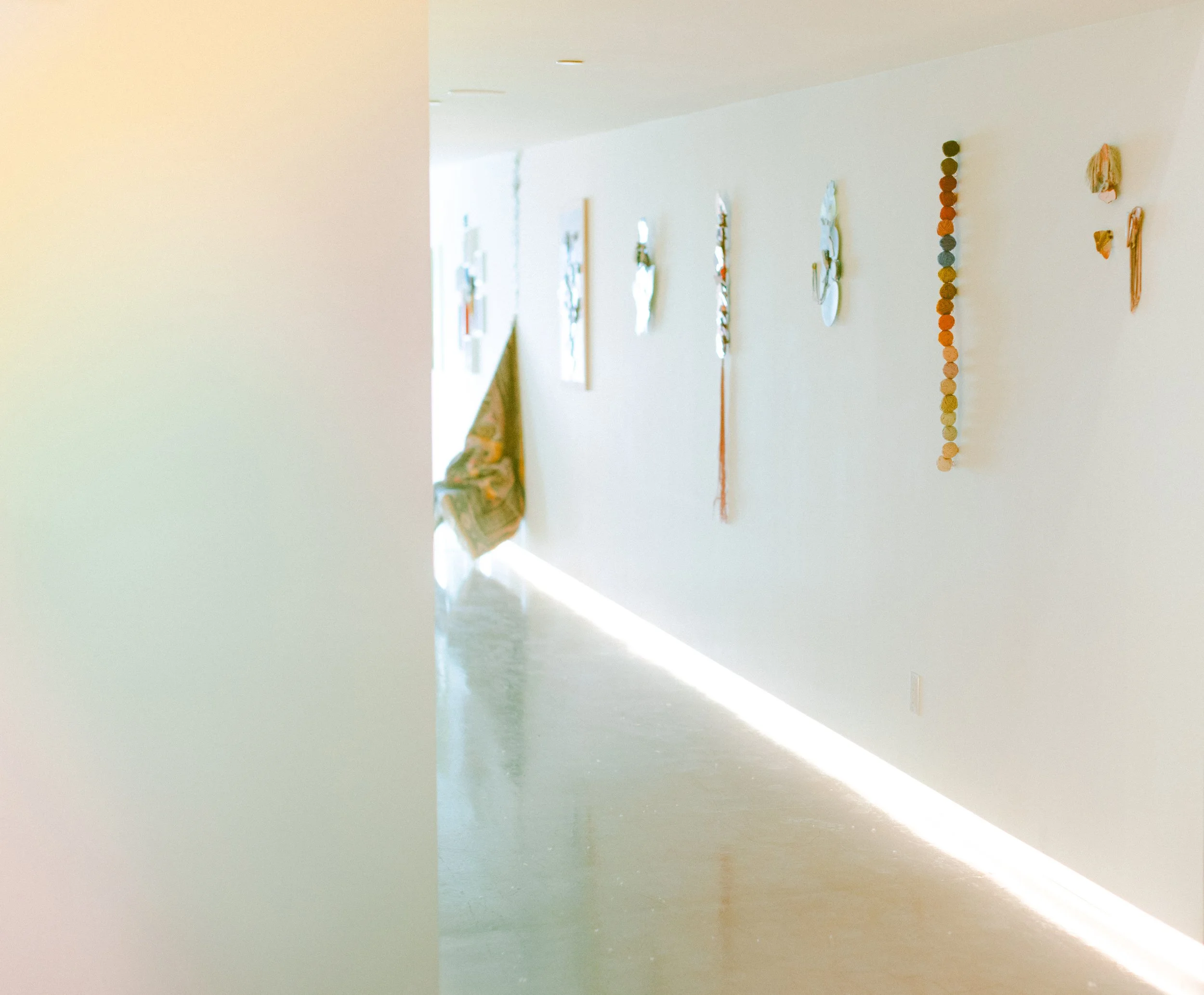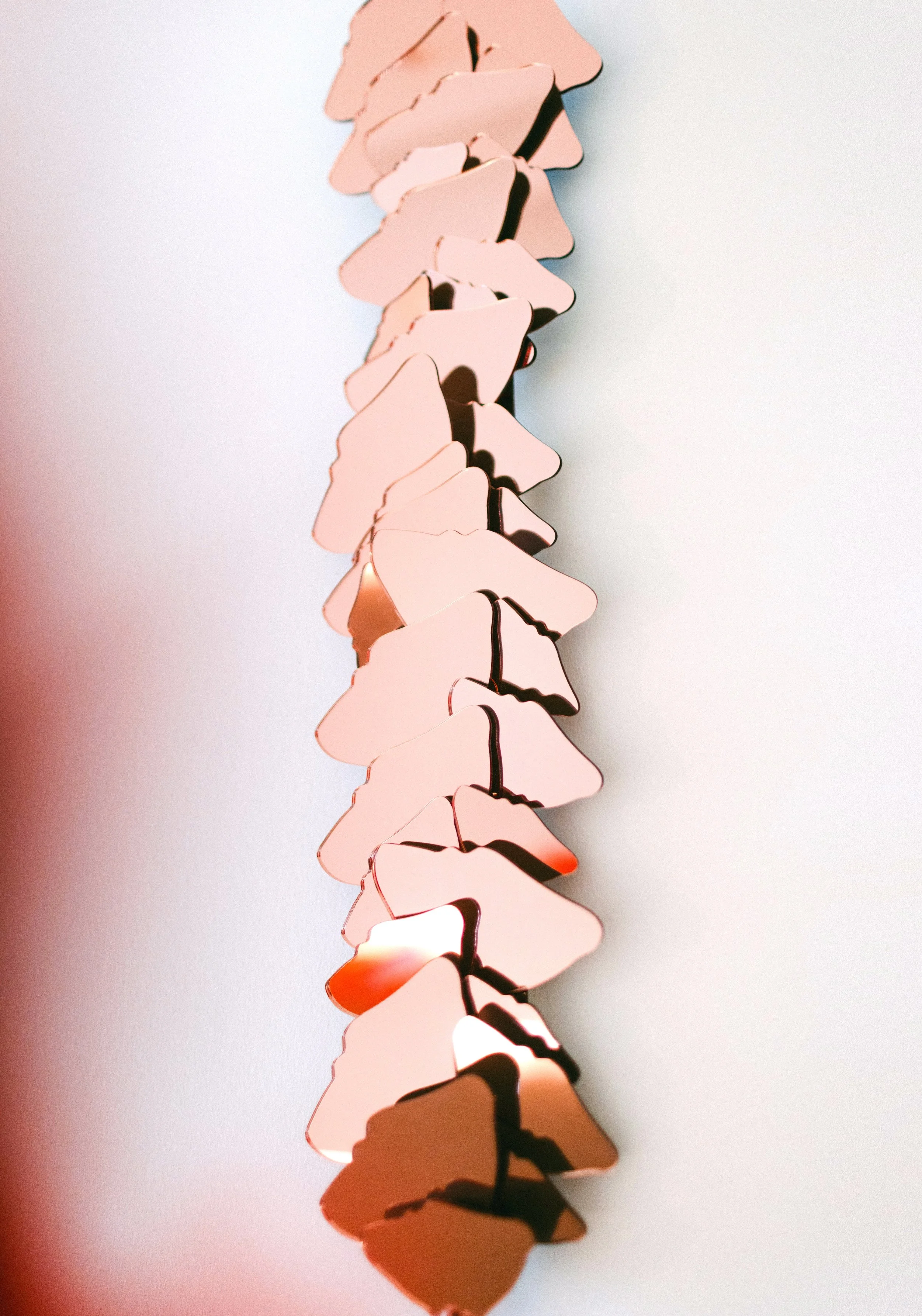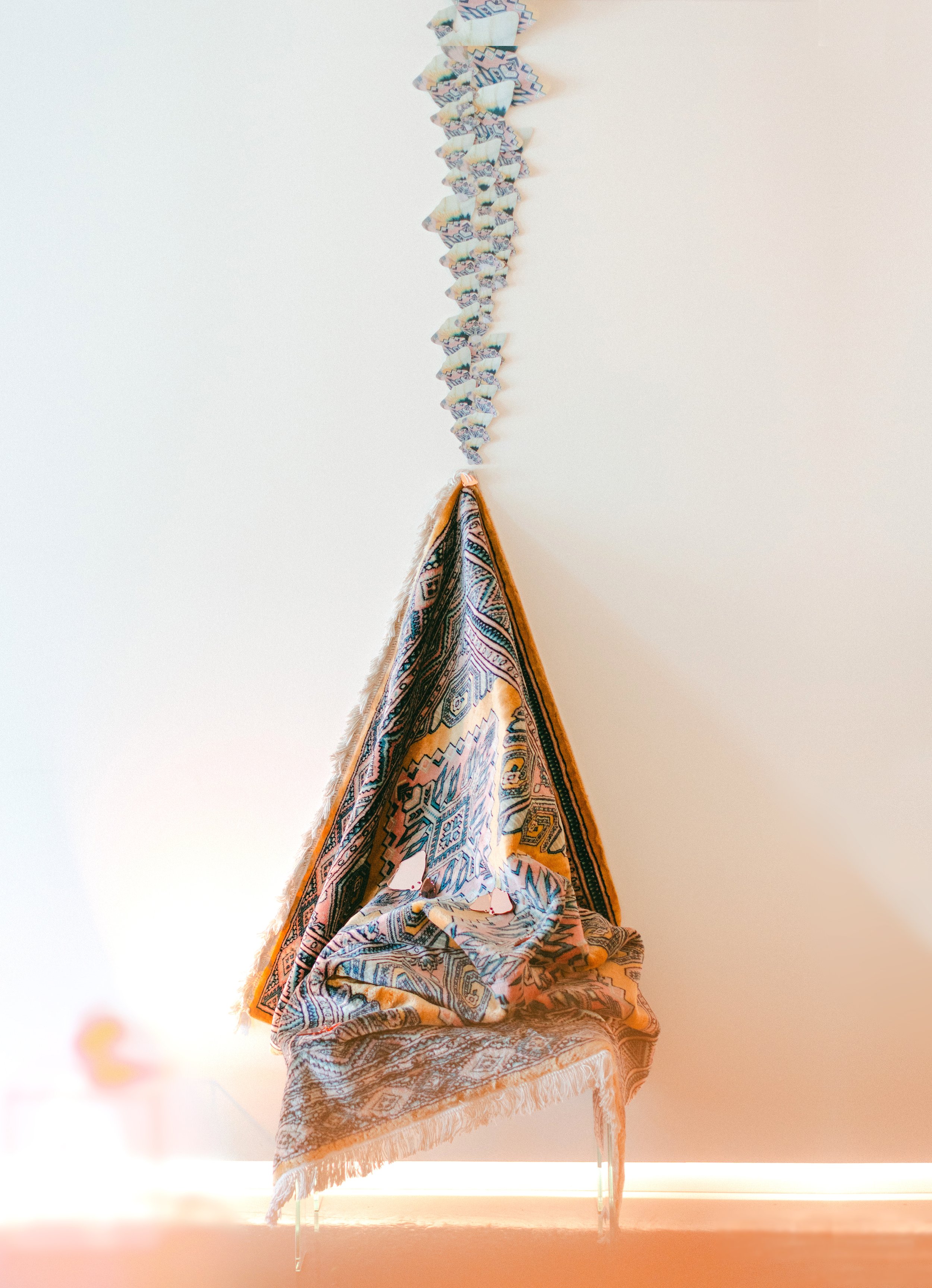 Robyn carries her passion for rugs into her art practice by combining natural hand-spun yarns from Nepal with hard, modern materials such as acrylic glass and mirror. The yarn holds warmth, tradition, and care, while the mirror and acrylic glass reflect a colder, fast-moving, manufactured world. Binding the soft fibres around the sharp edges of the glass becomes a quiet, meditative act in repair - where self-reflection occurs, and a tactile connection develops between the past and the present.