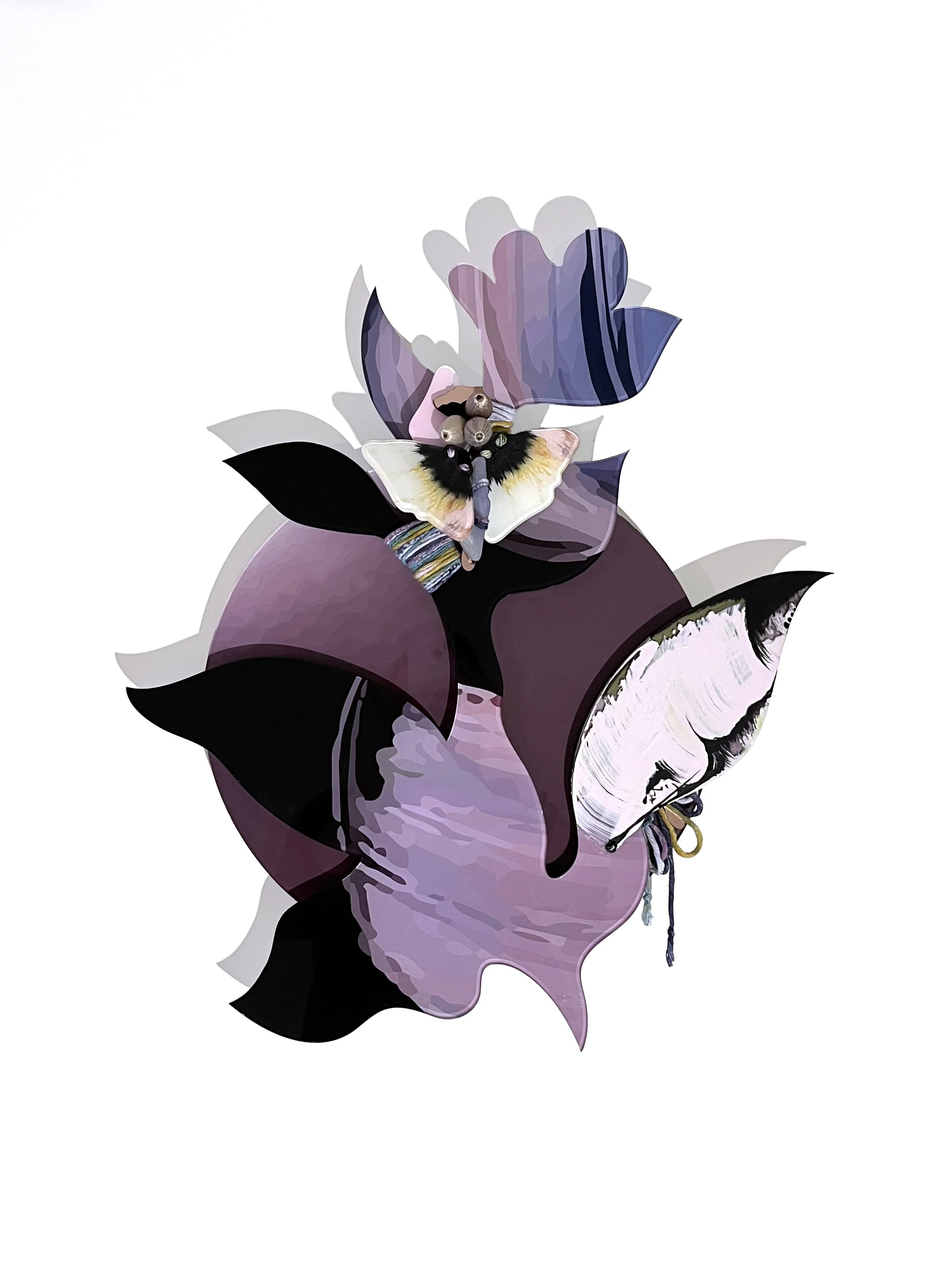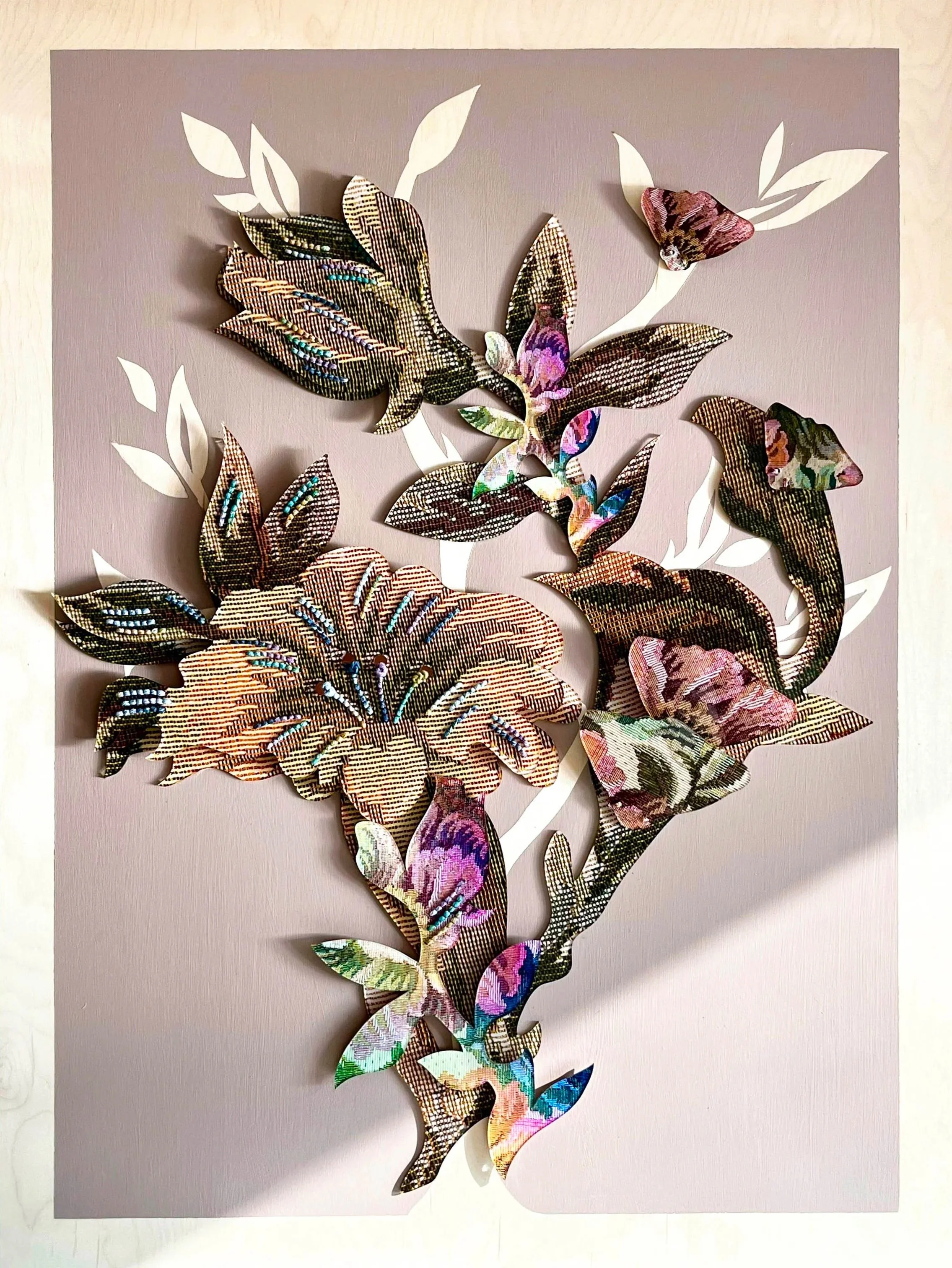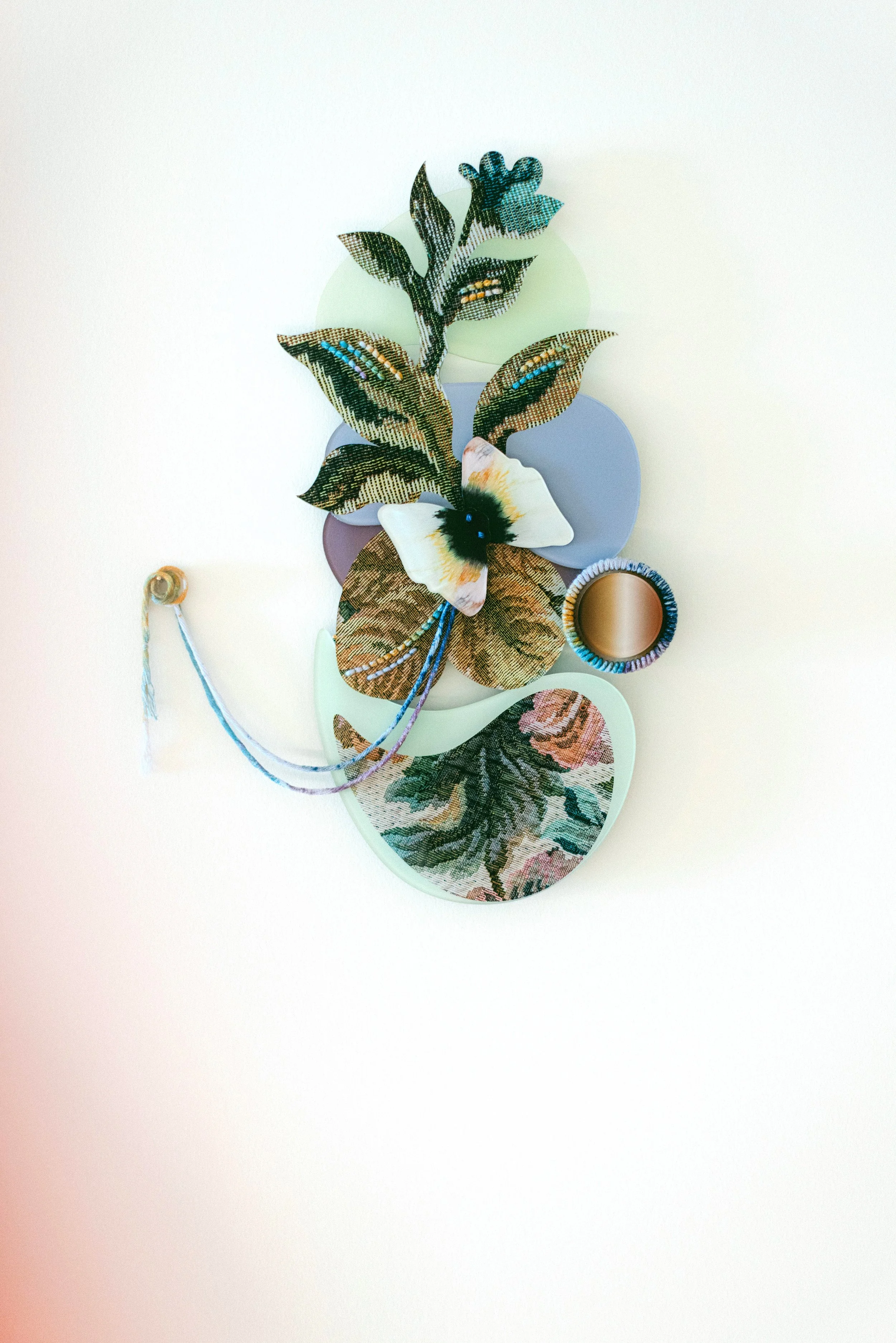 For Robyn, her artistic process and final works hold space for both pain and possibility. Her practice invites stillness, reflection, and the idea that healing doesn’t erase the past, but carries it forward with power and purpose. An abstracted moth motif pulses through many of her pieces, referencing both the quiet damage moths cause to carpets, and the transformative alchemy of silk. This tension reflects cycles of making and unmaking, where loss and creation co-exist in tandem. Each finished artwork becomes a suspended moment - an orb of release, where the artist finds inspiration and hope.