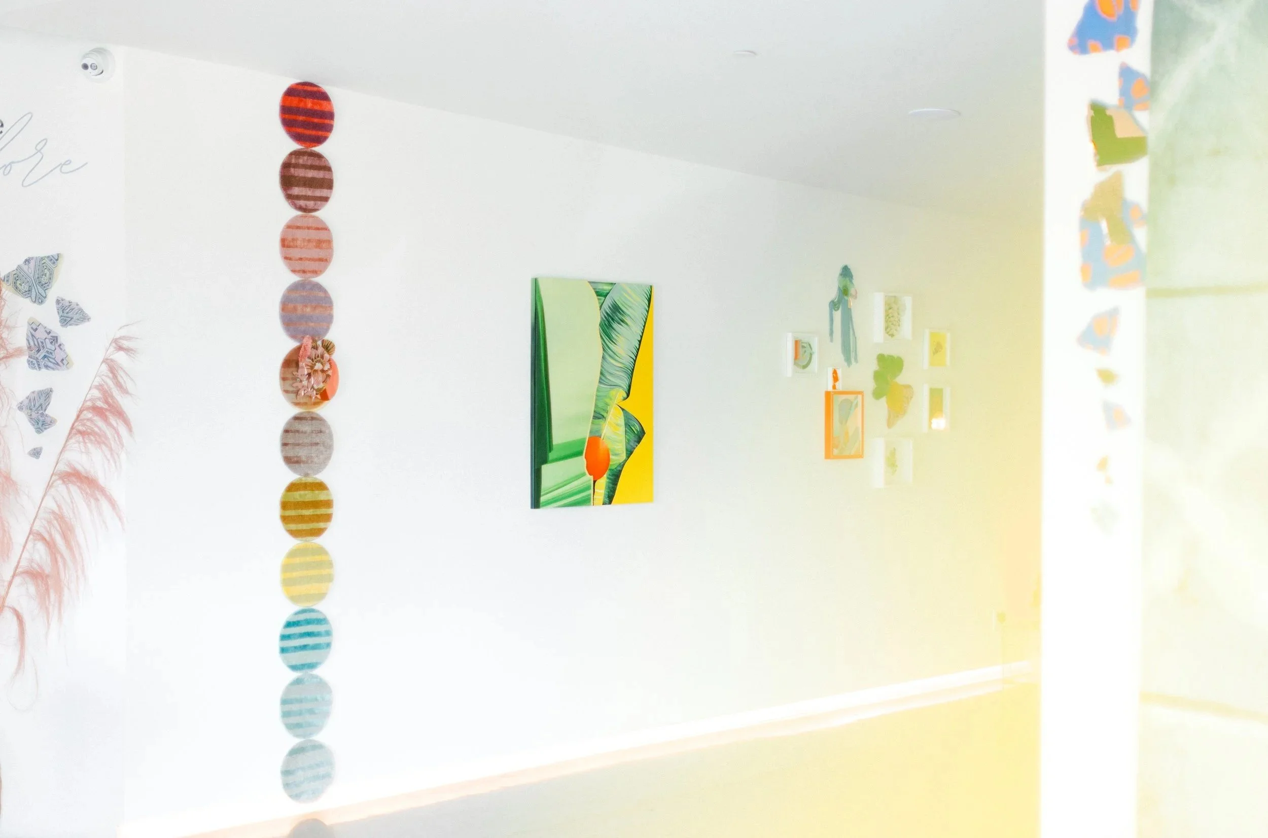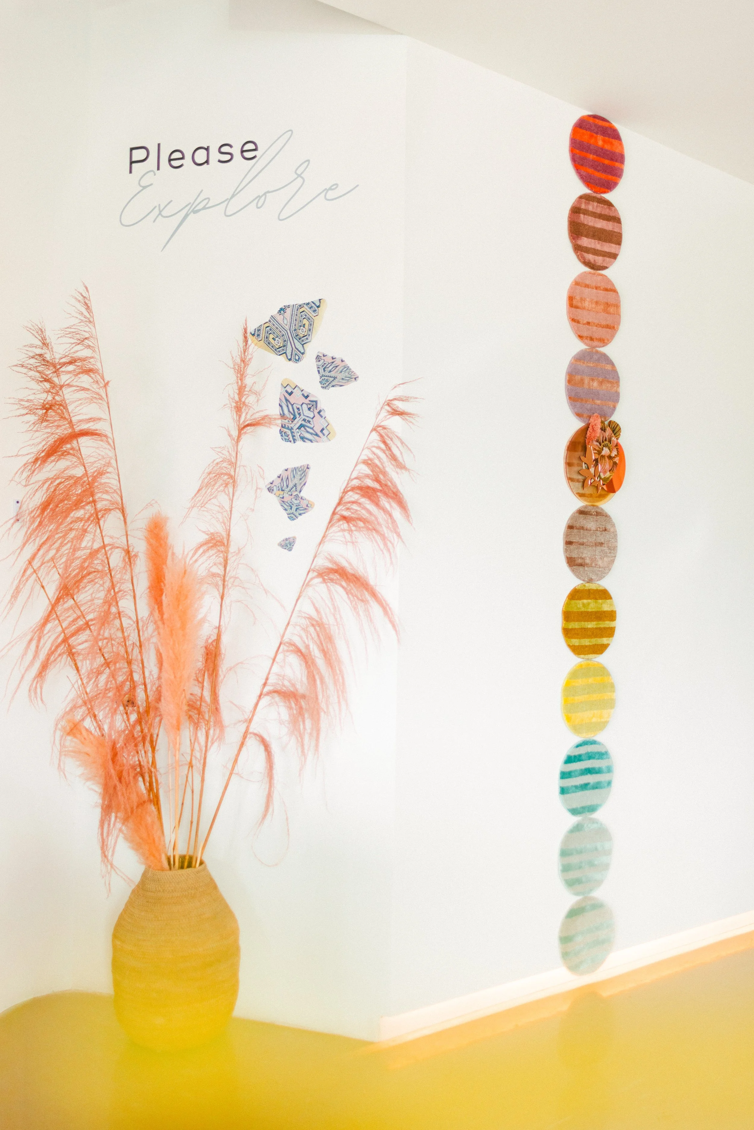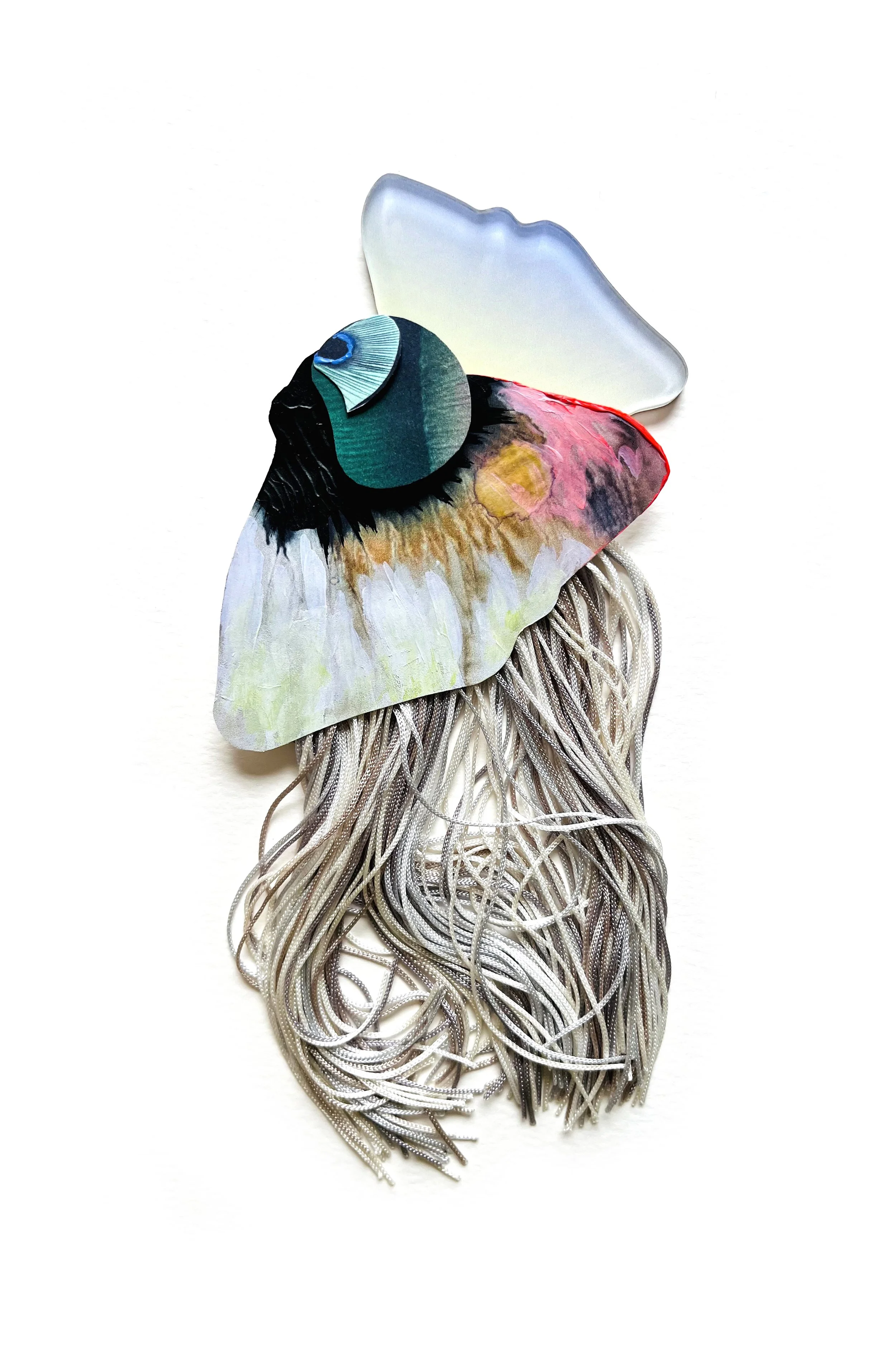For Robyn, her artistic process and final works hold space for both pain and possibility. Her practice invites stillness, reflection, and the idea that healing doesn’t erase the past, but carries it forward with power and purpose. An abstracted moth motif pulses through many of her pieces, referencing both the quiet damage moths cause to carpets, and the transformative alchemy of silk. This tension reflects cycles of making and unmaking, where loss and creation co-exist in tandem. Each finished artwork becomes a suspended moment - an orb of release, where the artist finds inspiration and hope.