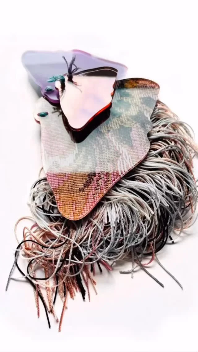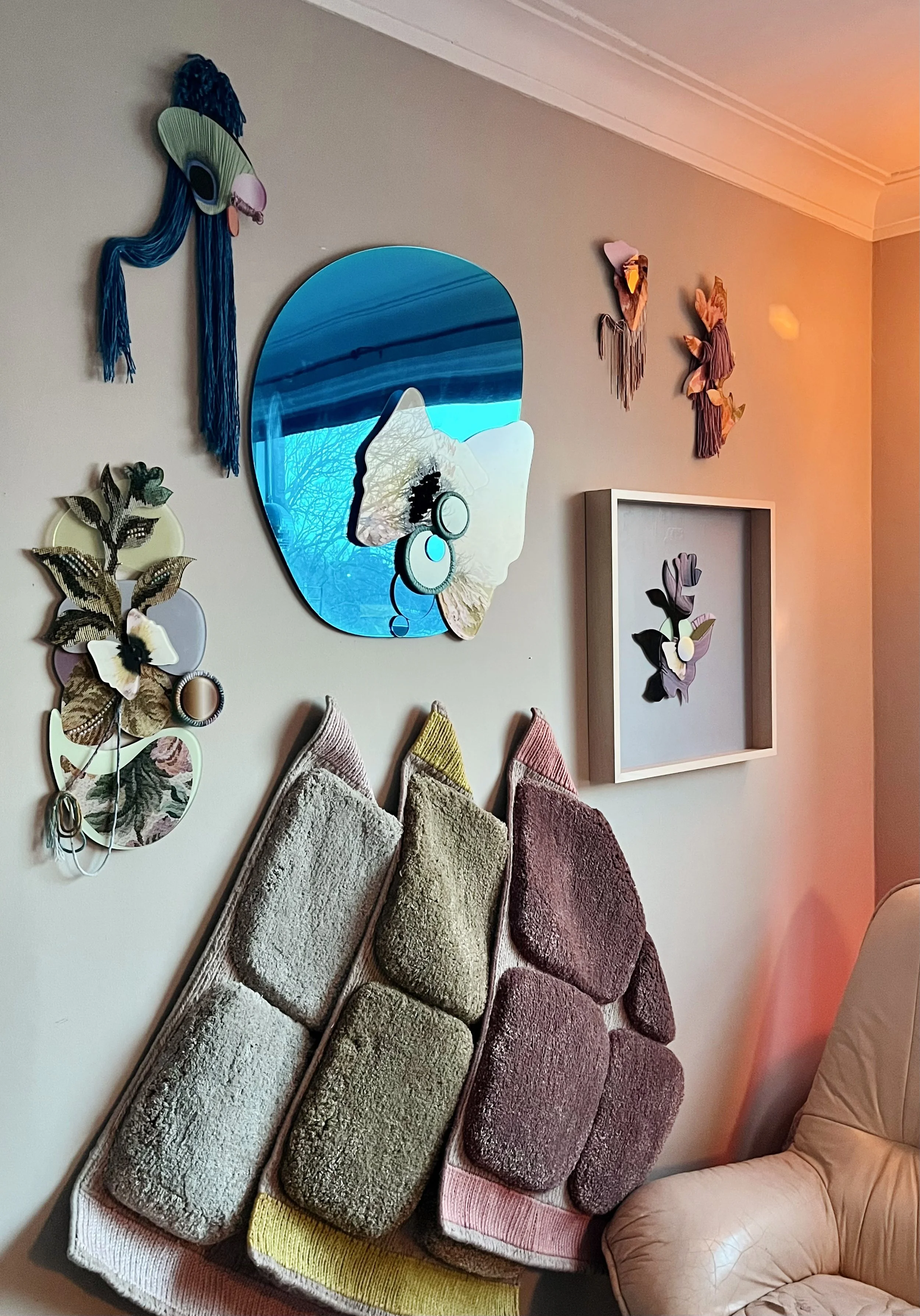 “I weave together soft, natural, hand-spun yarns from Nepal with hard, modern materials like plexiglass and mirror. The yarn holds warmth, tradition, and care, while the mirror and plexiglass reflect a colder, fast-moving, manufactured world. Binding the yarn around the sharp edges of the glass feels like stitching a wound; an intimate, meditative act where self-reflection occurs and distortion slowly gives way to clarity.”
