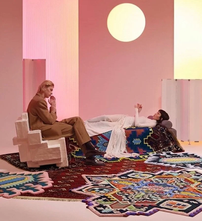 “For about fourteen years, I’ve been translating my illustrations, collages, and paintings into my rug designs that are hand-knotted in Nepal. In my latest series “Where Wings Tangle” I bring the process full circle - incorporating the same yarns used in my rugs, back into my artwork as embroidered elements. My rugs inspire my art, and then my art inspires my rugs. I find my practice helps me stay grounded in a craft that has shaped my livelihood, while paying tribute to the weavers I’ve been collaborating with for over a decade.”